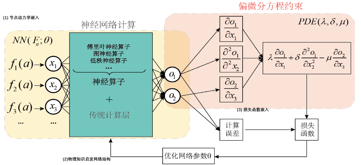 物理知识嵌入神经网络指将物理知识通过节点、结构、Loss损失函数等方式嵌入神经网络,构建具有物理可解释性,数据知识双驱动的算法模型。